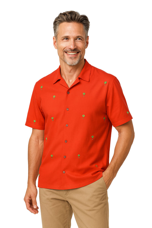 Oh Christmas Tree - Embroidered Christmas Aloha Shirt by Bamboo Cay - Tomato