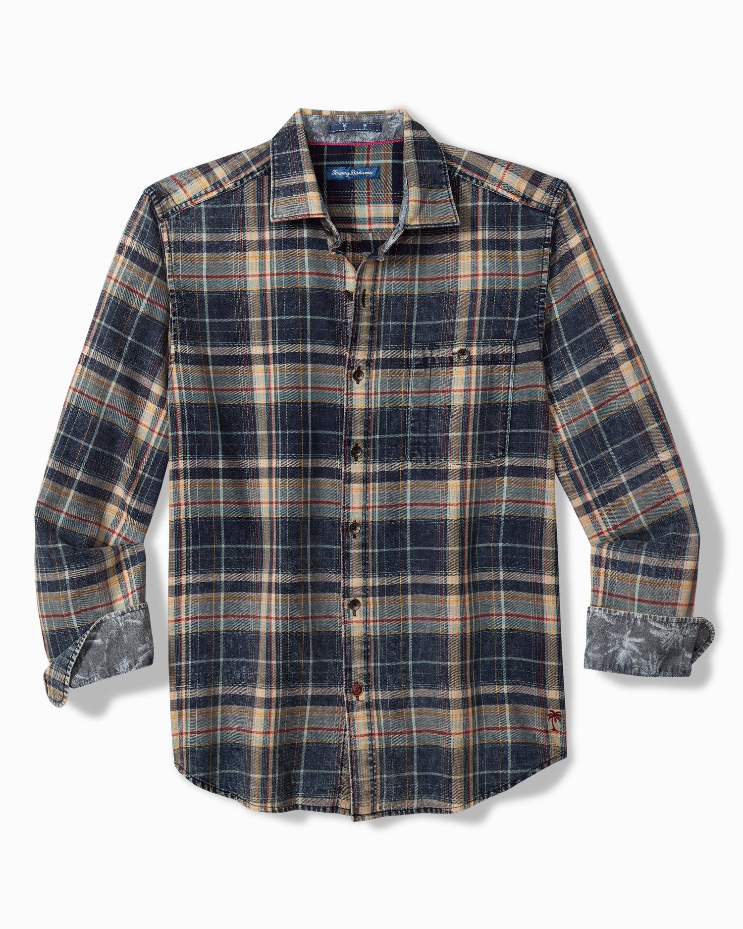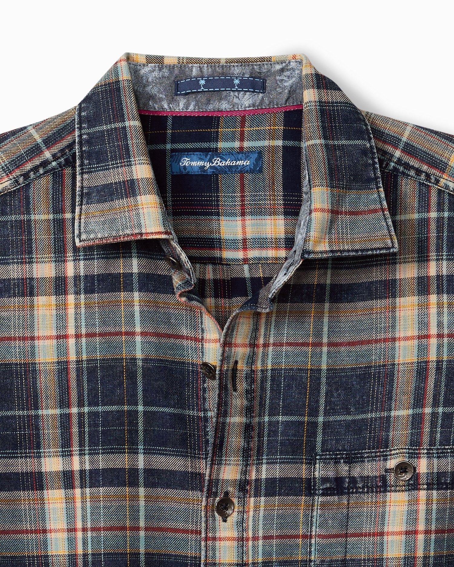 This sophisticated plaid pattern by Tommy Bahama defines the polished ease of this soft 100% cotton shirt, complete with a button-through patch pocket on the chest.