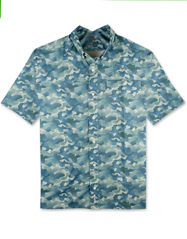 This button-down shirt includes a chest pocket with flap closure and a side-vented back panel for maximum breathability.