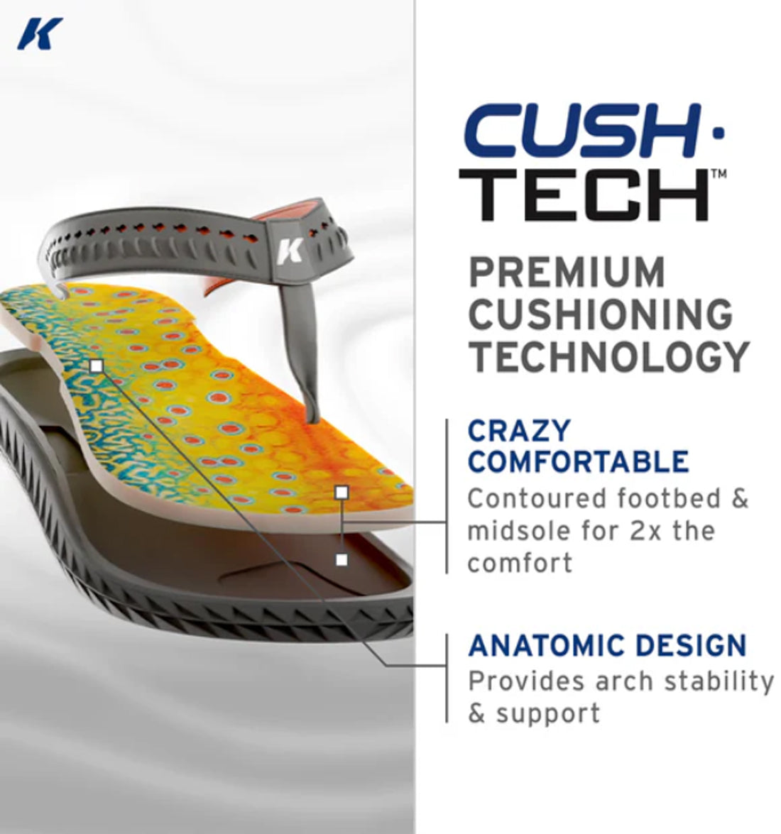 Comfort, traction, and style—summer starts here when you step into Korkers Fish Flips. Cush-Tech™ cushioning keeps every step light, the Kling-On Deck™ outsole grips any surface—even slick, wet decks—and bold fish prints from Derek DeYoung turn your shoes into wearable art.