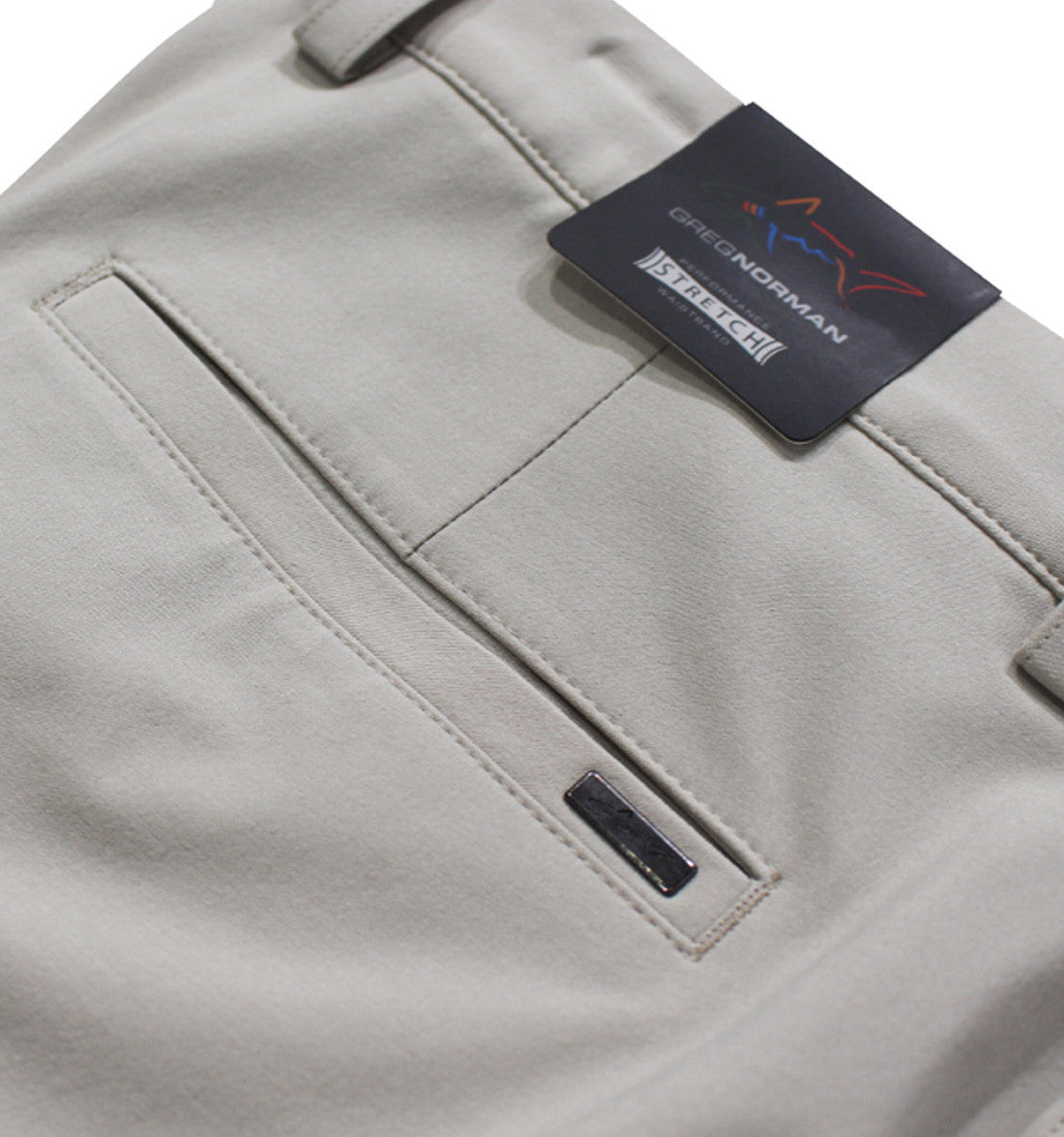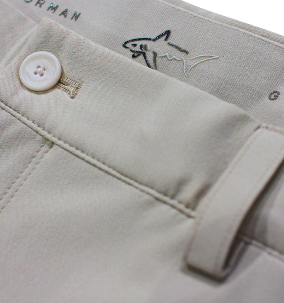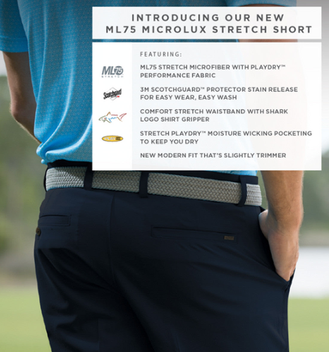 Greg Norman's 4-way stretch ML75 Microlux Stretch Short is 90% Microfiber Polyester and 10% Spandex Woven with Play Dry moisture wicking technology. It features a stretch shirt gripper waistband with the Shark logo that offers a comfort stretch in the waist along with a flat front look and 10 inch inseam.