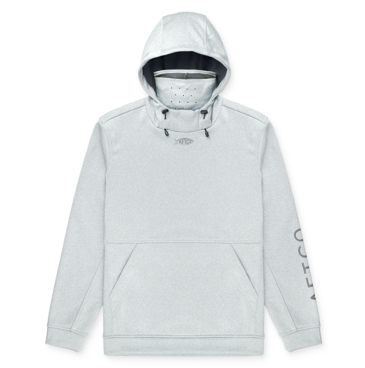 Aftco's Reaper Fishing Sweatshirt features an integrated face mask and neck warmer. This performance fleece hoodie AFTCO delivers with technical features like laser cut ventilation on mask and underarm area, a hood with our cinch shock cord anchoring system designed specifically for both bass fishing and saltwater fisherman as they run in their boats at high speeds, Block Tapey pocket closure on the front pouch pocket, AFGUARD stain release and a toasty 100% polybonded microfleece fabric.