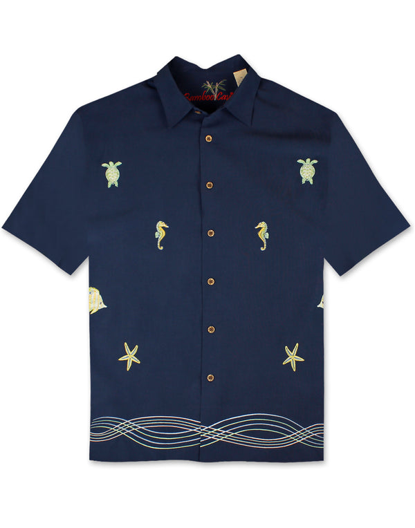 Get ready to make a splash with our Sporty Seahorse Camp Shirt by Bamboo Cay! This fun and stylish shirt features an intricate embroidered design of a seahorse, perfect for those who love marine life. Made with washable fabric, this shirt is easy to care for and perfect for any adventure.